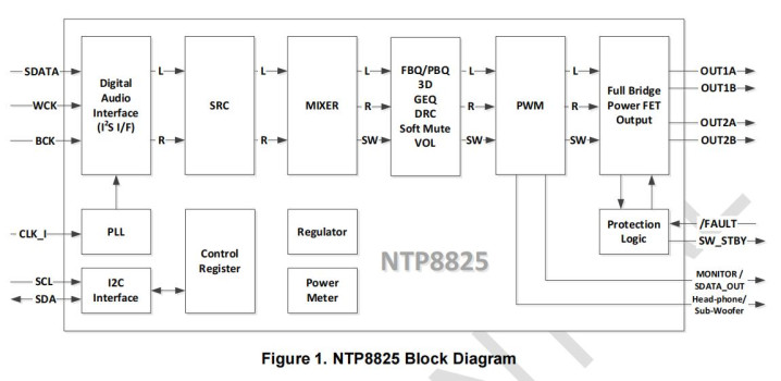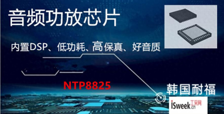 音频功放芯片NTP8825(内置DSP)该芯片接收采样频率从8kHz到192kHz的数字串行音频数据;提供2x25瓦的立体声模式与一个散热器;有一个混频器和双四轴滤波器,可用于实现基本的音频信号处理功能。